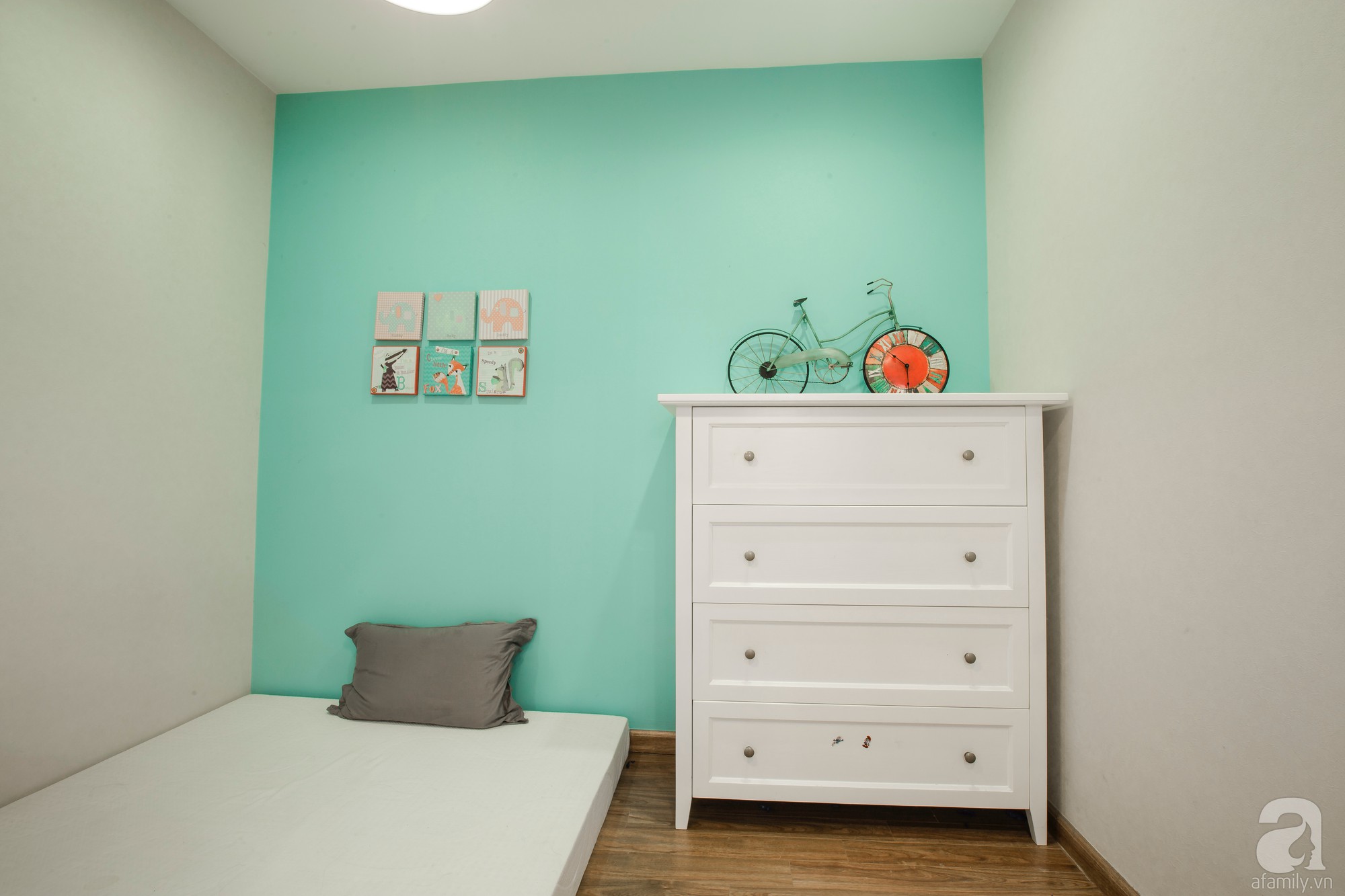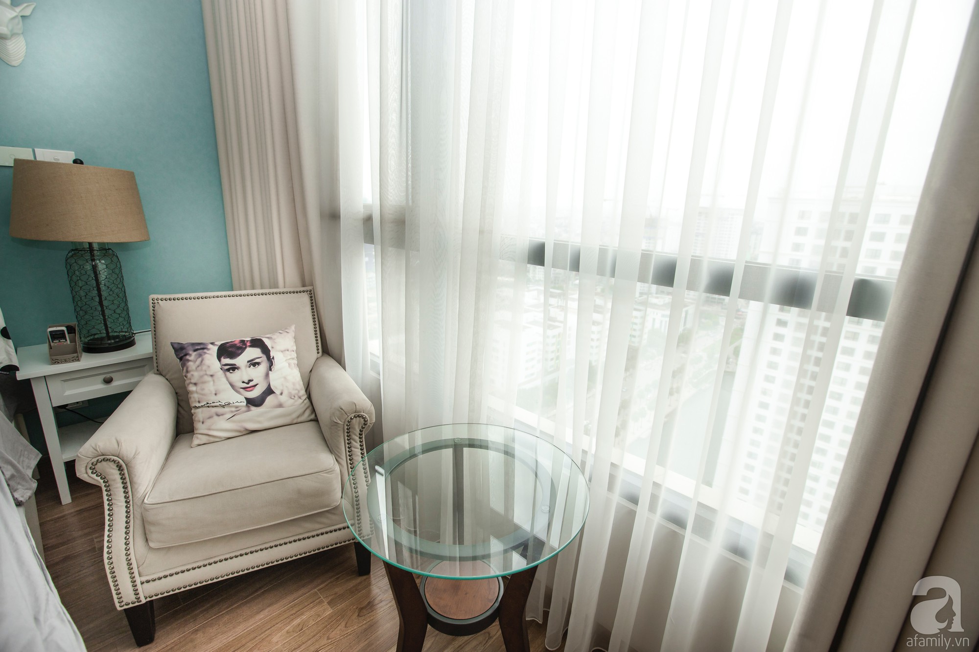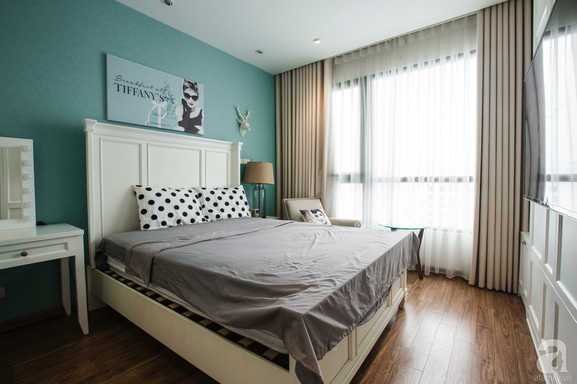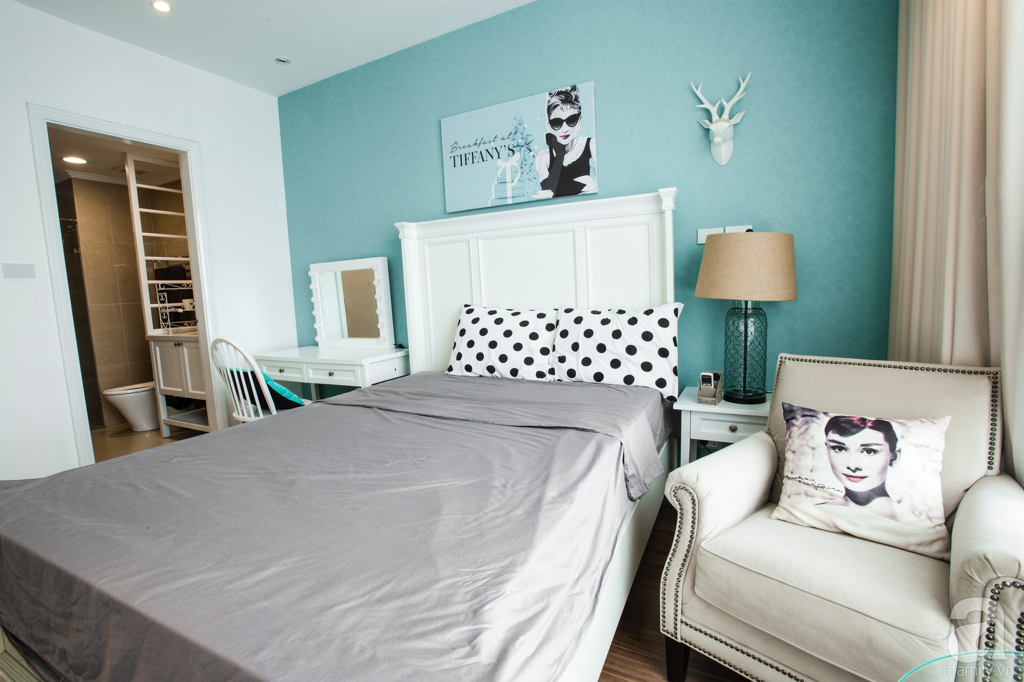 Chiếc giường màu be được đặt ở bức tường xanh ngọc vô cùng bắt mắt. Rèm cửa màu be đậm giúp không gian nghỉ ngơi nền nã,, trẻ trung hơn.