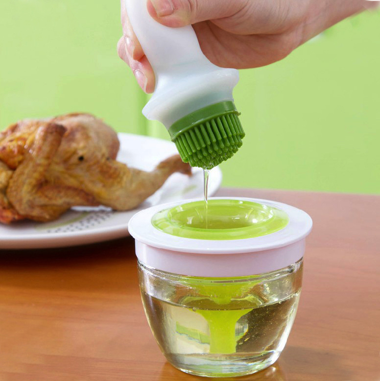 Nếu bạn muốn tiết kiệm dầu ăn hoặc nước cốt cần thêm khi chế biến món ăn nướng, quay,... thì sản phẩm này vô cùng phù hợp. Nó gồm 2 phần: phần lọ chứa dầu (hoặc nước cốt chanh, cốt tỏi, hành, mật ong,…), phần cọ khi nhúng vào có thể để chảy bớt chất lỏng vào lọ để tránh lãng phí và điều tiết được mức độ sử dụng. Lọ đựng bằng thủy tinh, dung tích 148ml, kích thước 10 x 8cm, cọ quét bằng silicone, màu xanh lá cây, kích thước 11 x 5cm, giá thành khoảng 15.000 đồng/chiếc.